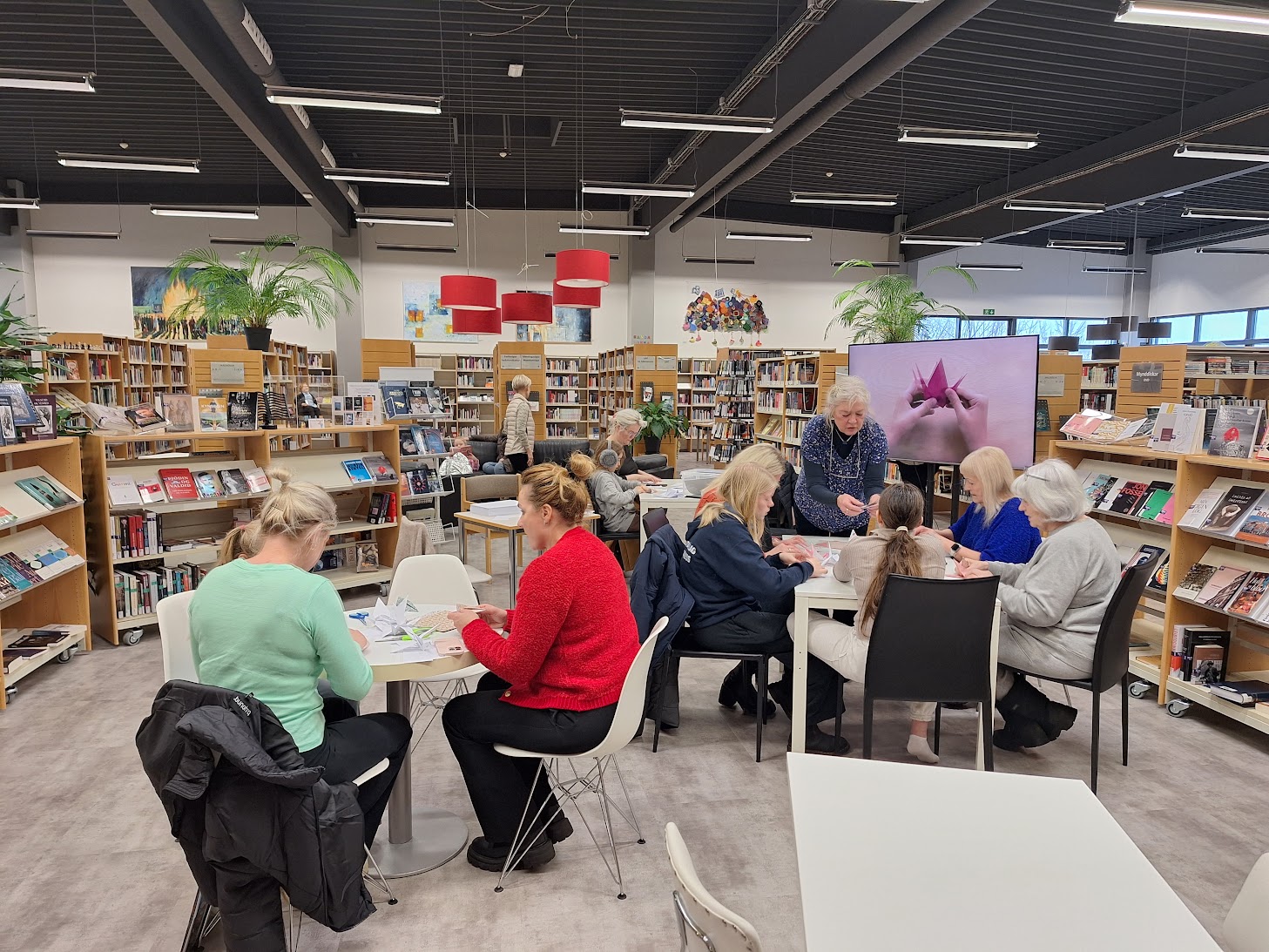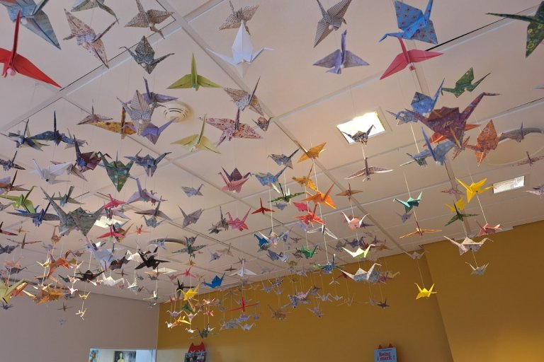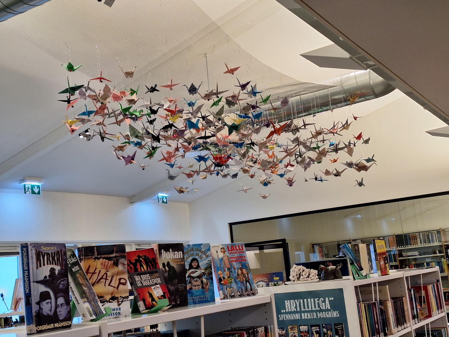 Origami er aldagamal japanskt pappírsbrot og trönur eru heilagir og táknrænir fuglar í Japan og segir þjóðtrúin að með því að brjóta 1000 trönur á einu ári verði ósk manns uppfyllt. Markmið okkar var að ná að brjóta 1000 trönur fyrir friði í heiminum, en þær urðu nær 2000. Við byrjuðum á verkefninu í janúar og unnum það í samvinnu við Bókasafn Akraness, Brekkubæjarskóla, Fjölbrautaskólann, Grundaskóla og Félagsstarf aldraðra. Úr þessu urðu sannkölluð listaverk og stærst þeirra er staðsett á Bókasafni Akraness, hin eru á bókasöfnum skólanna og í aðstöðu Félagsstarfs Akraneskaupstaðar. Verkin er hægt að skoða á opnunartíma þessara stofnana. Nú er komið að því að ljúka verkefninu með lokahófi á Bókasafninu miðvikudaginn 29. okt. klukkan 17:00 og þar munum við kynna verkefnið í heild sinni.