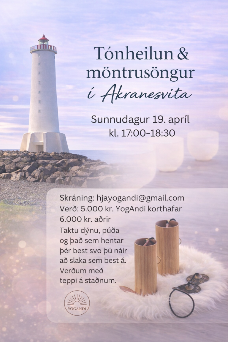 Nærandi og notaleg stund í Akranesvita. Tónheilun með Berglindi og möntrusöngur með YogAndi. Heitt te í boði. Gott að koma vel klæddur, með undirlag og púða svo það fari sem best um þig. Getur valið um að leggjast eða sitja.