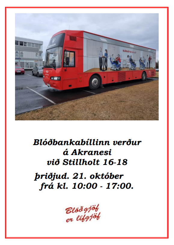 Blóðbankabíllinn verður á Akranesi næsta þriðjudag, þann 21. október, milli klukkan 10 og 17.