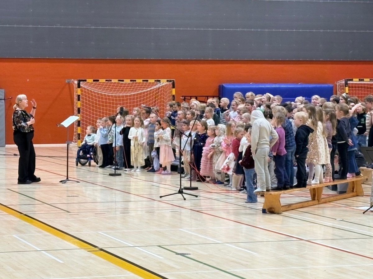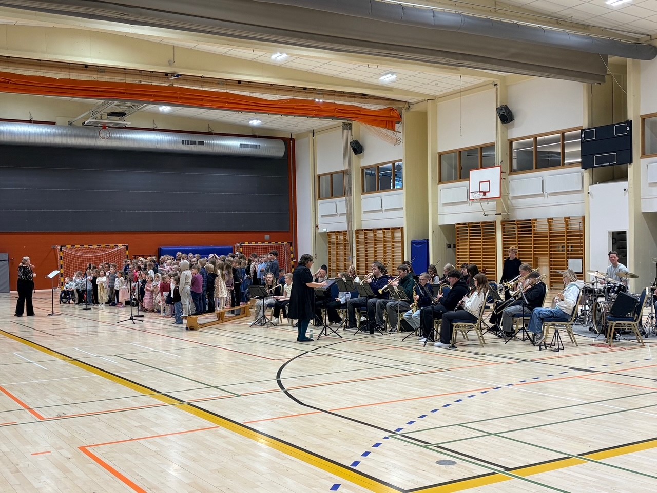 Það var þétt setið í stúkunni í íþróttahúsinu á Vesturgötu þegar elstu börnin í öllum leikskólum Akraness og Skýjaborgar í Hvalfjarðarsveit héldu tónleika. Um var að ræða samstarfsverkefni Tónlistarskólans á Akranesi og leikskólanna fimm, en auk þeirra rúmlega 100 barna sem sungu spilaði 20 manna hljómsveit tónlistarskólans undir.