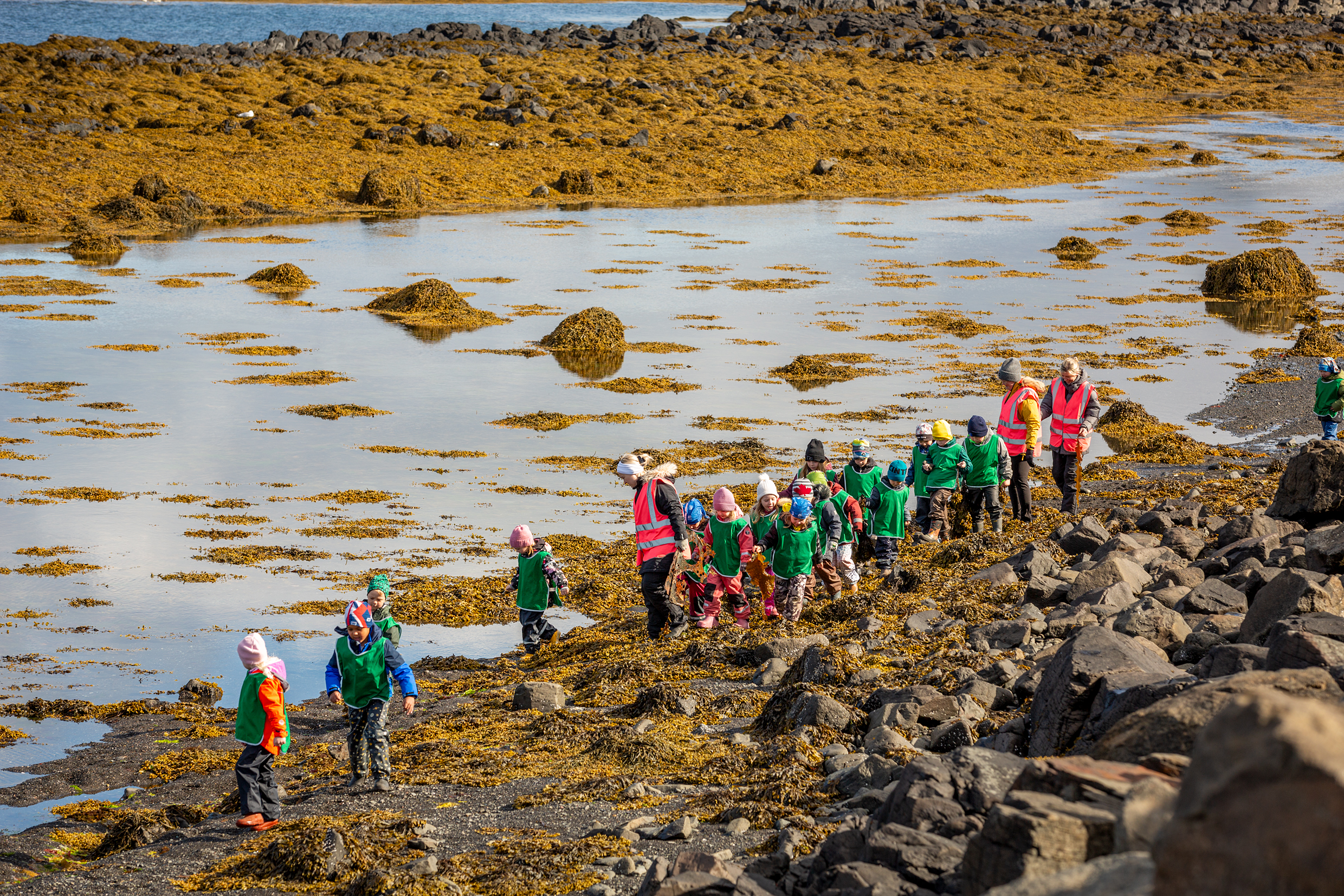 Verkefnið hófst með því að elstu deildir leikskólanna fengu fræðandi og skemmtilega heimsókn frá þeim Helenu Guttormsdóttur (Hellu) og Kristrúnu Sigurbjörnsdóttur (Krissu) þar sem þær fjölluðu um lífríki fjaranna og skapandi kveikjur sem finna má í fjörum. Heimsóknin snerti á hinum ýmsu skynfærum, þau sáu áhugaverð og endurtekin form kuðunga, líkindin með appelsínu og ígulkeri, hlustuðu á kuðungana, komu við þang og þefuðu ásamt því að fá að smakka söl.
