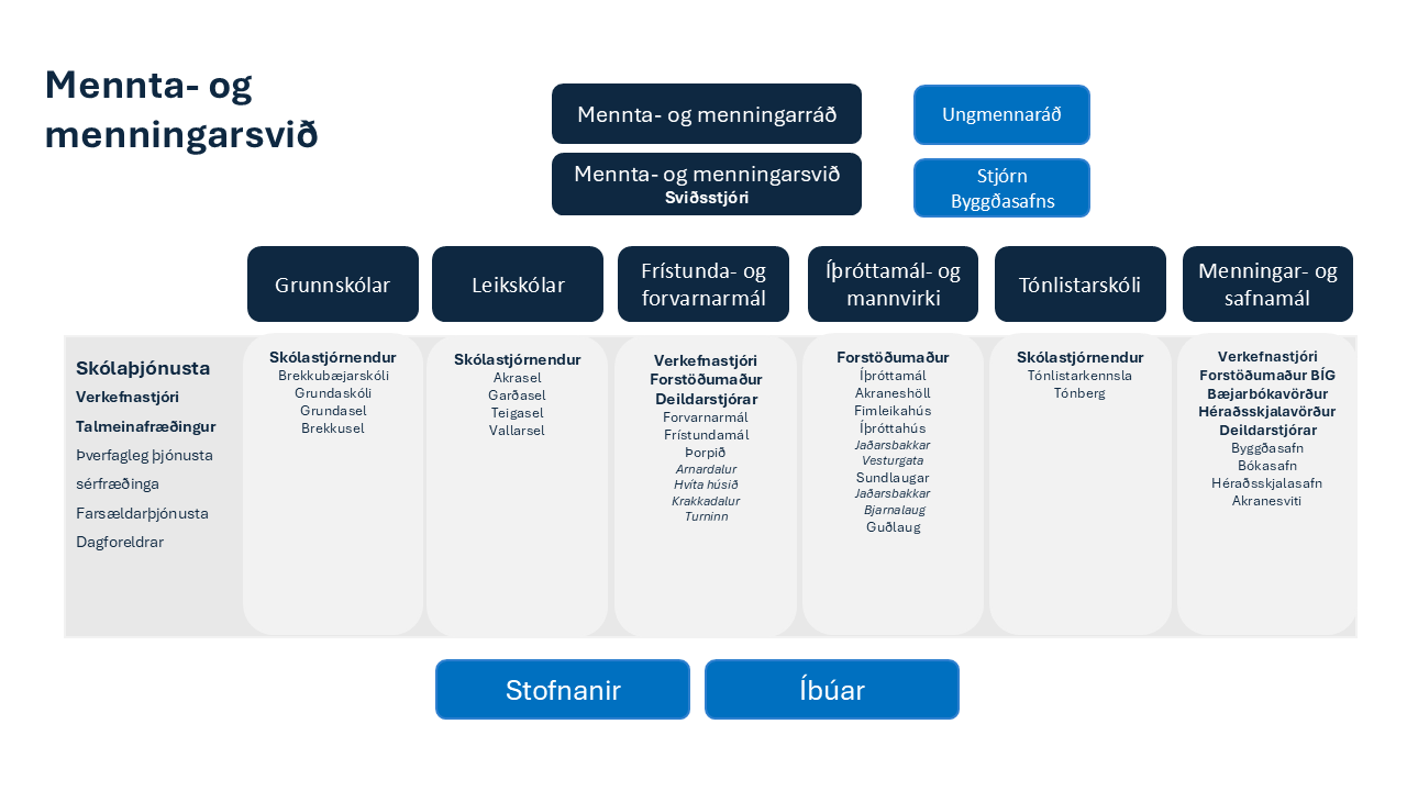 Mennta- og menningarsvið er stjórnunareining innan Akraneskaupstaðar sem sérhæfir sig málefnum grunn-, leik- og tónlistarskóla, forvarnamálum, æskulýðs-, tómstunda- og íþróttamálum, daggæslu barna, vinnuskólanum og þróun samstarfs Akraneskaupstaðar við t.d. Símenntunarmiðstöð Vesturlands og Fjölbrautaskóla Vesturlands. Sviðið sér m.a. um innritun barna í skóla Akraneskaupstaðar, undirbúning þjónustukannanna á vegum stofnana sem tilheyra sviðinu, vinnur að þróun skólastarfs og undirbúningi stefnumörkunar, umsjón með sérfræðiþjónustu við grunn- og leikskóla, annars áætlanagerð, annast mat og eftirlit með skólastarfi og sinnir upplýsingamiðlun fyrir skóla- og frístundaráð. Þá hefur sviðið umsjón og eftirlit með rekstri íþrótta- og æskulýðsstarfsemi og forvarnarmálum á vegum Akraneskaupstaðar, annast fagþjónustu við íþrótta- og æskulýðsstarfsemi, ber ábyrgð á stefnumótun, áætlanagerð og rekstri starfsstaða og samskiptum við fagaðila, félög og samtök, íþróttahreyfinguna og almenning.