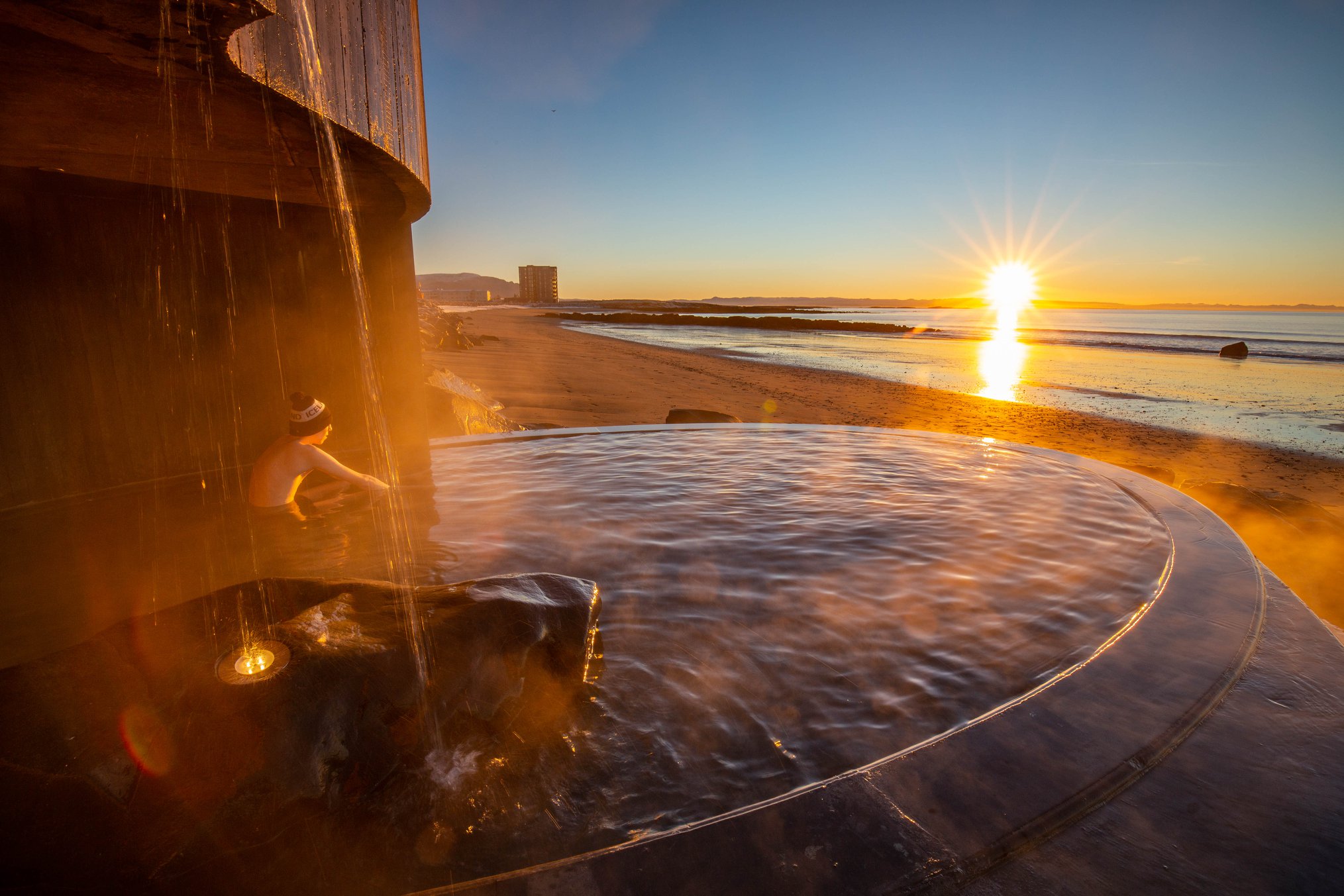 Á Langasandi er hægt að baða sig í sjónum og njóta útsýnisins í Guðlaugu sem er heit laug staðsett í grjótgarðinum á Langasandi.