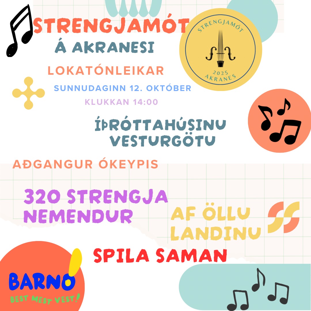 Um 320 nemendur í tónlistarskólum um land allt munu lita bæjarlífið hér á Akranesi um helgina ásamt foreldrum og kennurum. Tilefnið er svokallað Strengjamót sem er haldið annað hvert ár á Íslandi og var raunað haldið á Akranesi í fyrsta skipti árið 1992.