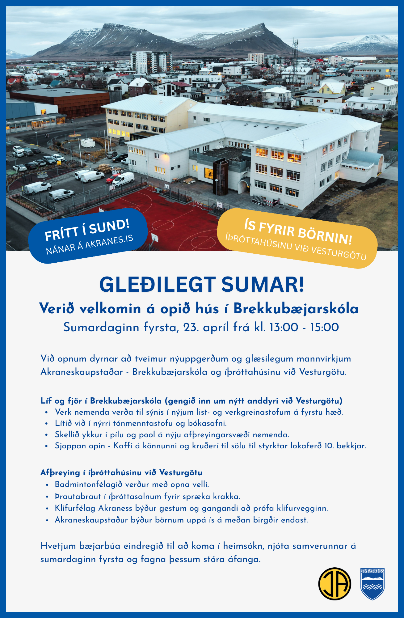 Opið hús verður í Brekkubæjarskóla og íþróttahúsinu við Vesturgötu á sumardaginn fyrsta, nánar tiltekið fimmtudaginn 23. apríl milli kl. 13 og 15.